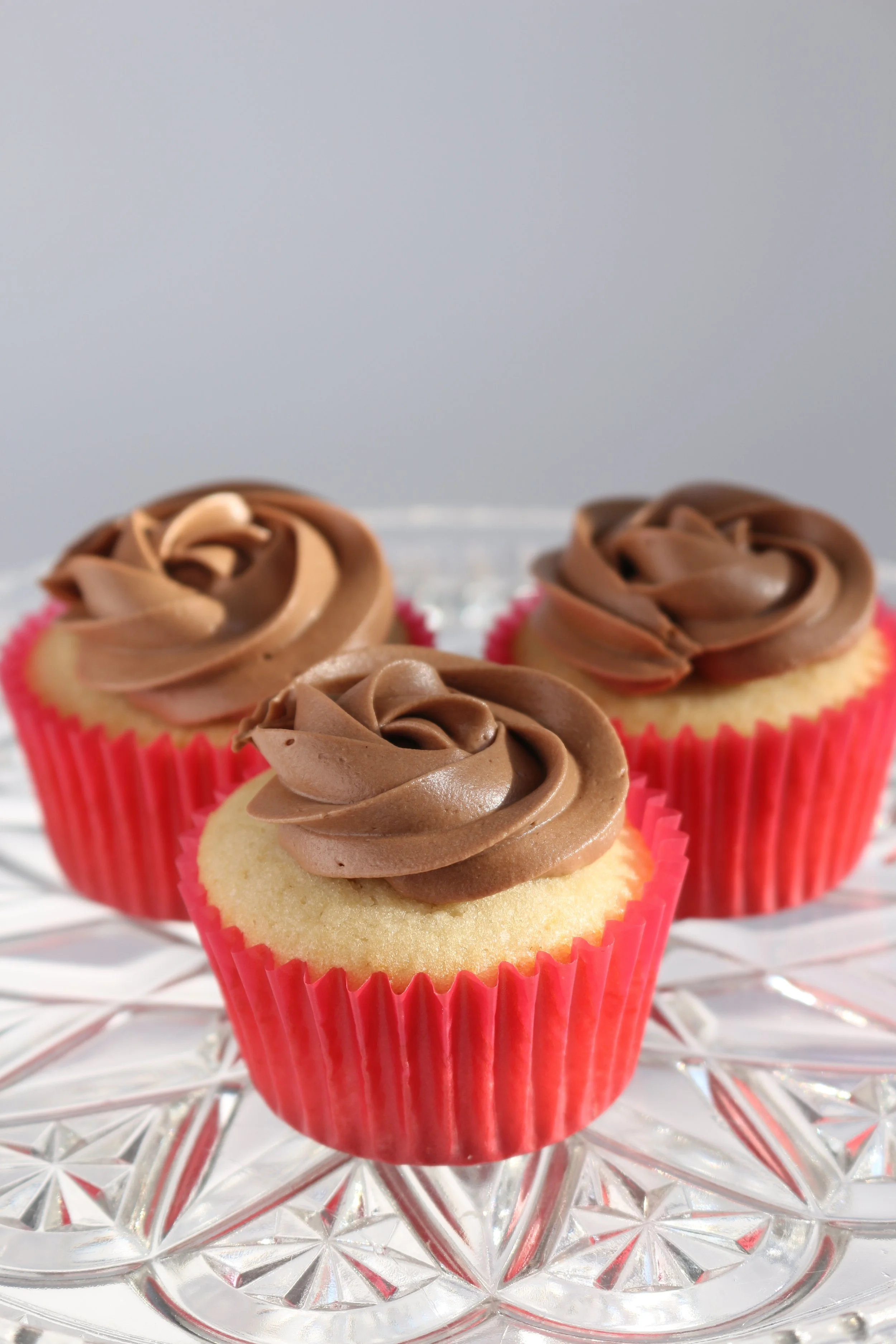 A classic choice for a party! These vanilla cupcakes are soft and light, and frosted with a smooth chocolate Swiss meringue buttercream.